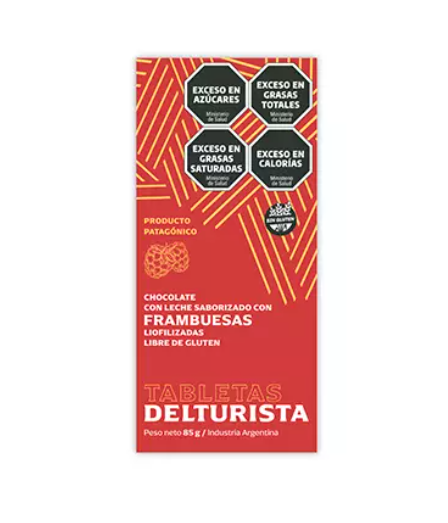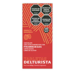 Tableta de 85 gramos, chocolate con leche saborizado con frambuesas liofilizadas. Libre de gluten.
